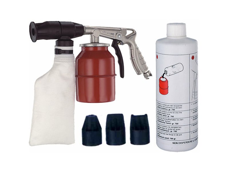KIT A/211 11/A CON UGELLI KIT PISTOLA PER SABBIATURA A RECUPERO AUTOMATICO Contiene: • N° 1 pistola per sabbiatura a recupero automatico (A/211) • N° 1 barattolo di sabbia da 700 g (BOX/3) • N° 4 ugelli sagomati in gomma (S/215) The kit contains: • 1 sandblasting gun with automatic rrecovery system (A/211) • 1 Bottle of synthetic grit - 700 g (BOX/3) • 4 molded rubber nozzle (S/215