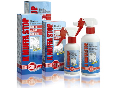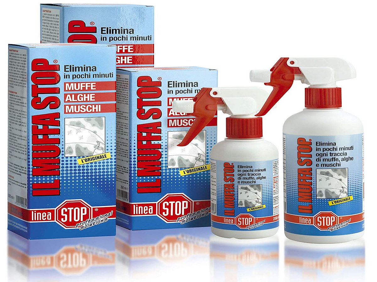 Muffa stop – spray. ... Muffa stop – spray è un detergente a base di cloro attivo concentrato, che elimina, combatte e previene, la formazione e la crescita di muffe, alghe e muschi, in modo radicale e in pochi minuti, sia all'interno che all'esterno