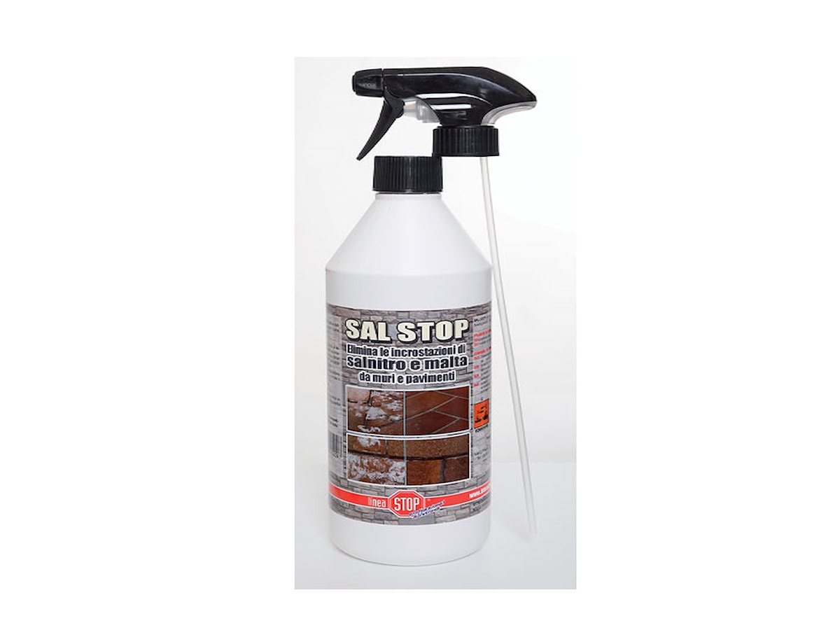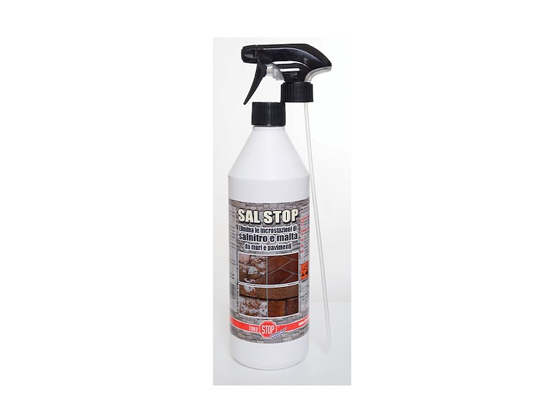 SAL STOP LT 1 ANTI SALNITRO Prodotto pronto all'uso, puro o diluito asporta le incrostazioni di malta e salnitro da pavimenti e pareti acido-resistenti come gres, klinker, cotto e ceramica; può essere usato mediante macchinari o semplicemente spruzzato sulla superficie da pulire.