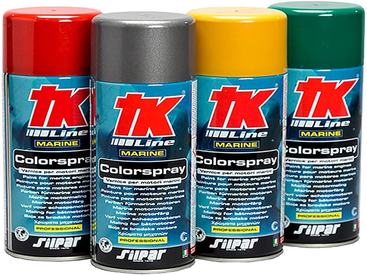 TK ColorSpray. Vernice spray per motori marini. Vernice nitrocombinata a rapida essiccazione, elevata resistenza al graffio e agli agenti atmosferici, per la verniciatura ed il ritocco rapido di gambi, piedi poppieri e calandre. I colori TK sono disponibili nelle tinte originali delle marche dei motori marini entro e fuoribordo più diffusi sul mercato.